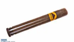 This 5.5×50 tubed stick features a dark brown rustic firmly packed wrapper with small veins, tight seams, double cap, buttery soft feel and pungent rich sweet coffee aroma finished with a closed foot. First light reveals an extremely tight draw with a possible knot near the band. Massaging it produced enough opening for a mild-medium smoke with very smooth aged tobacco like flavors of a slight sweet coffee with the same through the long finish. The first third gets a bit better construction wise, with a better draw and medium bodied smoke with flavors of a deep tobacco and oak on the draw with a dark sweetness joining in through the finish, almost a licorice flavor. The 1/2 way point comes at 35 minutes transitioning to a tobacco core with slight coffee and cocoa quickly followed by a deeper smooth plain finish. Construction is better with good thick smoke output, solid ash and a razor sharp burn. Finishing at 1:15 the last third just went to a plain earth.