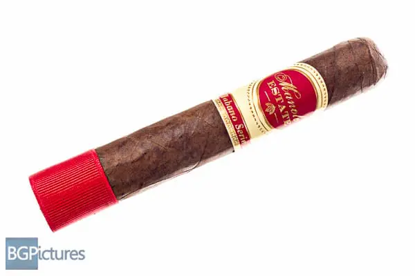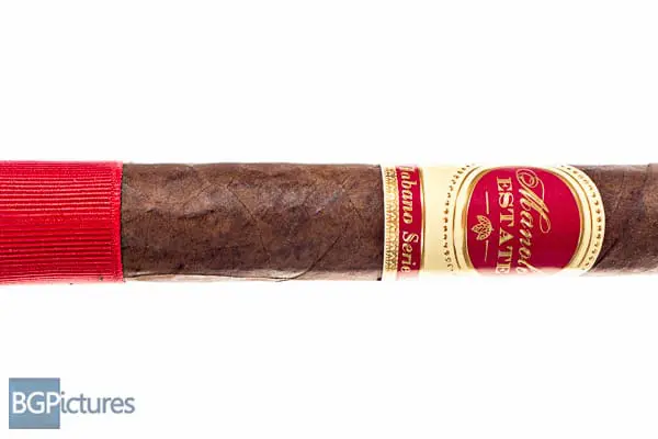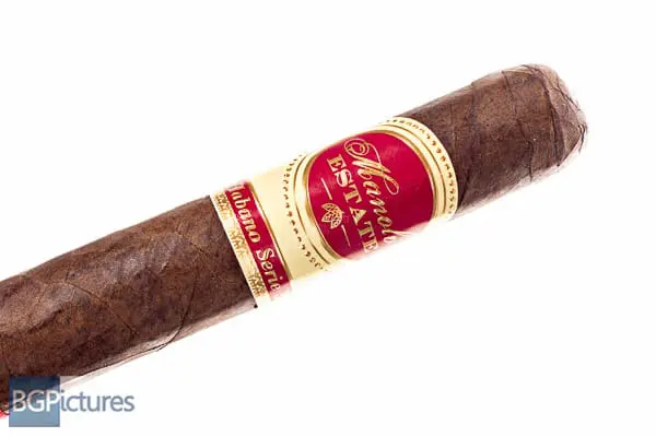 Manolo Estate Habano Serie 32 Robusto Cigar Review – This 5×50 stick features a dark chocolate mottled wrapper with a soft even pack, oily satin finished feel with small veins, tight invisible seams, triple cap and very faint floral aroma.  First light reveals a perfect draw with copious amounts of thick chewy full bodied smoke showing flavors of a deep caramel, nuttiness, leather, dark cocoa then a slight sweetness on the long finish.  The first third continues the great performance going to a creamy leather and nuttiness that carries over to a substantial but bright finish.  Hitting the 1/2 way point at 25 minutes the 2nd third shows no flavor changes, drops the ash in a solid chunk with a razor sharp burn.  Ending at 50 minutes the last third remained consistent.