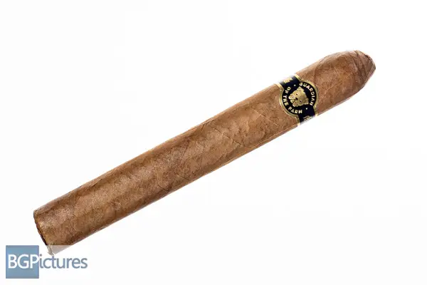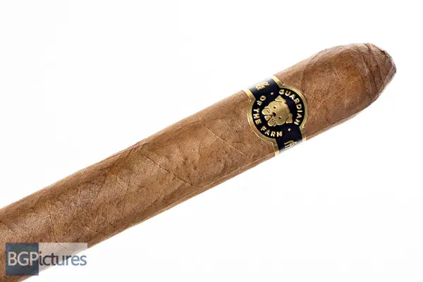 Guardian of the Farm Campeon Cigar Review – This 6×52 stick, a joint production from Casa Fernandez and Warped, features a dark tan firmly packed wrapper with an oily buttery feel, minimal veins tight invisible seams, a small tapered head and faint sweet nutty aroma. First light reveals a snug draw with medium bodied flavors of a dry dusty earth, slight pepper and sweet spice on the long finish. The first third opens the draw nicely while flavors are unchanged, just getting thicker and syrupy. The 1/2 way point comes at 35 minutes adding a nice leather on the draw, dropping short ash chunks with a razor sharp burn. Ending at an hour the last third showed no flavor changes.
