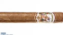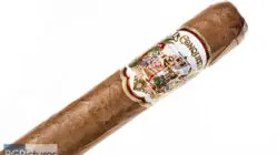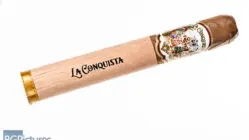 Gran Habano La Conquista Gran Robusto Cigar Review – This 6×54 stick features a large cedar sleeve covering a dusty grey brown wrapper with a soft even pack, satin feel, minimal veins, tight invisible seams, large double cap and faint tobacco aroma. First light reveals a perfect draw with plumes of mild-medium bodied smoke showing notes of creamy smooth oily sweet natural tobacco on a short clean finish. The first third shows no changes but has good construction. 25 minutes in at the 1/2 way point there’s a hint of vanilla, the ash drops in a solid chunk and that’s it. Finishing at 55 minutes the last third just shifts the vanilla to a subtle honey.