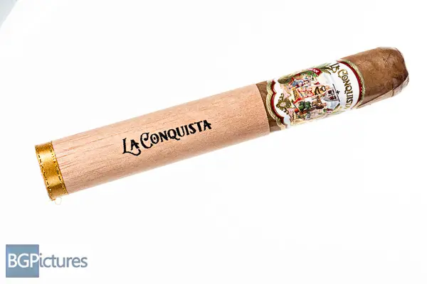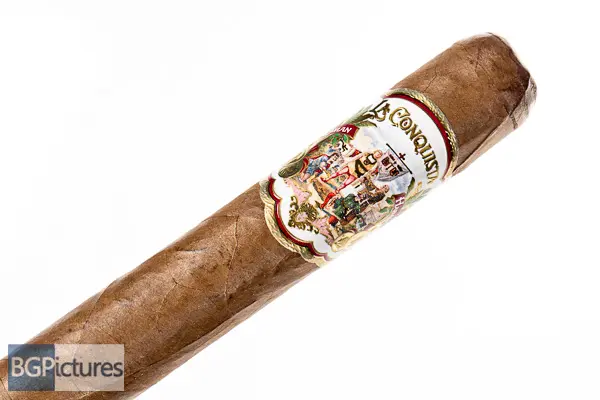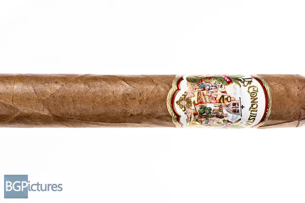 Gran Habano La Conquista Gran Robusto Cigar Review – This 6×54 stick features a large cedar sleeve covering a dusty grey brown wrapper with a soft even pack, satin feel, minimal veins, tight invisible seams, large double cap and faint tobacco aroma. First light reveals a perfect draw with plumes of mild-medium bodied smoke showing notes of creamy smooth oily sweet natural tobacco on a short clean finish. The first third shows no changes but has good construction. 25 minutes in at the 1/2 way point there’s a hint of vanilla, the ash drops in a solid chunk and that’s it. Finishing at 55 minutes the last third just shifts the vanilla to a subtle honey.