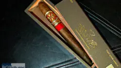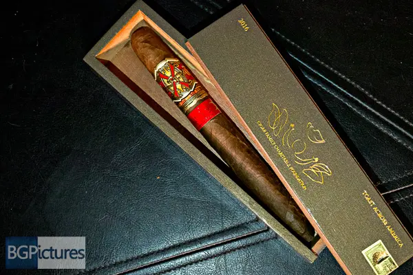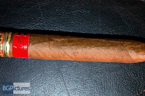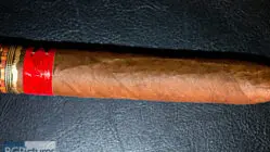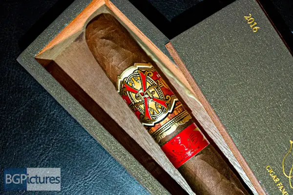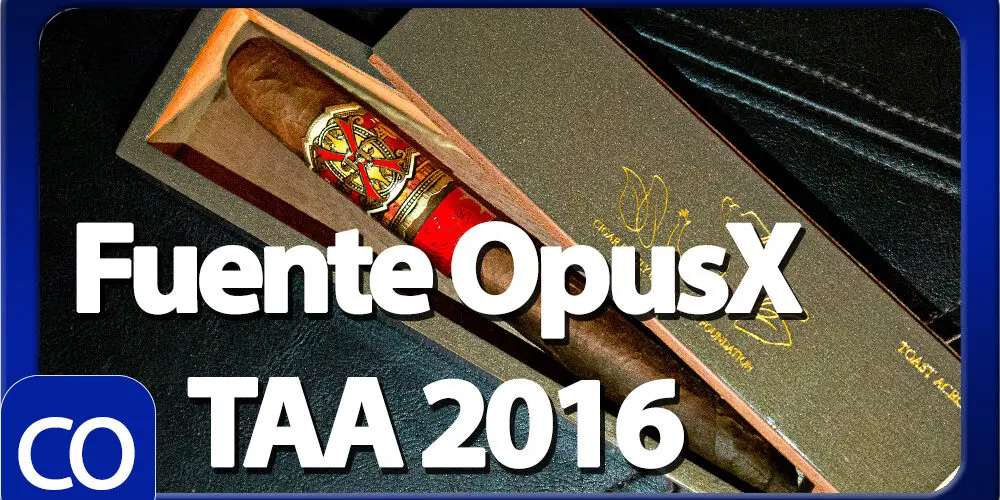 Fuente Fuente OpusX TAA 2016 Cigar Review – This 7 5/8 x 54 perfecto shaped stick features a dark brown firmly packed wrapper with a dry paper bag feel, minimal veins, tight invisible seams, triple cap and pungent macadamia nut aroma. First light reveals a perfect draw with a syrupy sweet oily nuttiness with a slightly dry long finish. The first third burns slowly and perfectly adding a nice pepper and spice kick with a dry roasted nut along with a balanced syrupy caramel sweetness. The 1/2 way point comes at a slow 40 minutes with flavors largely the same, just the nuttiness replaced by the typical Fuente woodiness, keeping everything else. Ending at 1:20 the last third opened the draw producing even more smoke with a creamy vanilla joining in and the pepper dying down only coming through at the tail end of the finish.