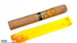 Perdomo Reserve 10th Anniv. Champagne Epicure Cigar Review – This 6×54 stick features a silky smooth tan wrapper with a firm pack, minimal veins, tight invisible seams, large double cap and potent manure aroma. First light reveals a great draw with plentiful medium bodied smoke showing notes of a slightly sweet cashew followed by a cayenne heat and hint of pepper with a long finish. The first third burns wonky and very quickly, shifting to a nutty wood with hint of pepper shifting down to a mild-medium body. The band had a ton of glue, taking off a chunk of wrapper. Ending at 55 minutes the last bit was exactly the same flavors to the nub.