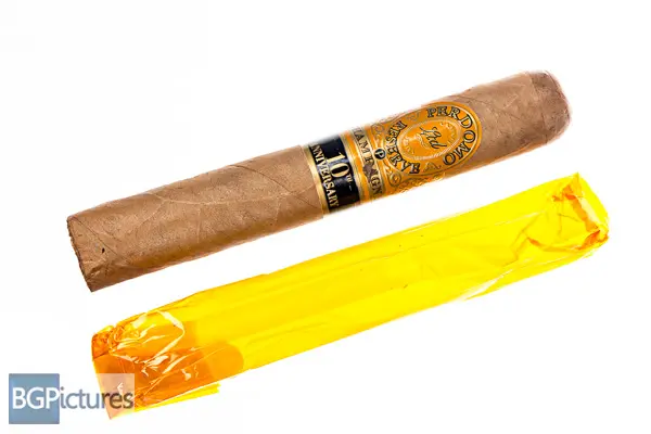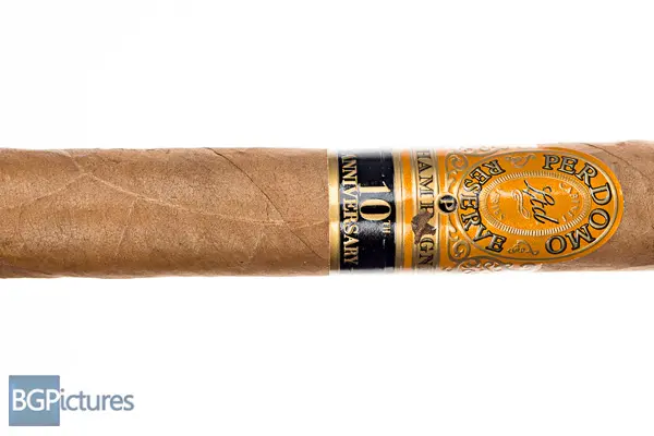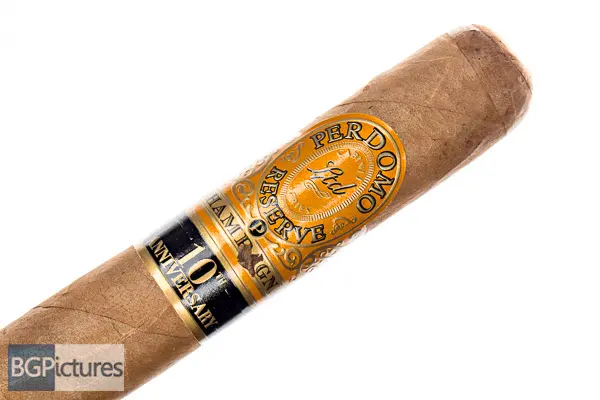 Perdomo Reserve 10th Anniv. Champagne Epicure Cigar Review – This 6×54 stick features a silky smooth tan wrapper with a firm pack, minimal veins, tight invisible seams, large double cap and potent manure aroma. First light reveals a great draw with plentiful medium bodied smoke showing notes of a slightly sweet cashew followed by a cayenne heat and hint of pepper with a long finish. The first third burns wonky and very quickly, shifting to a nutty wood with hint of pepper shifting down to a mild-medium body. The band had a ton of glue, taking off a chunk of wrapper. Ending at 55 minutes the last bit was exactly the same flavors to the nub.