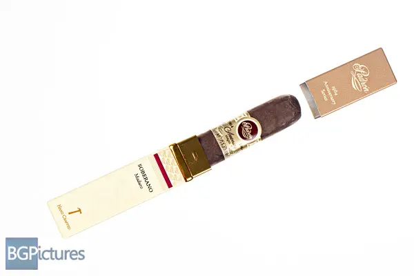 Padron 1964 Soberano Maduro Cigar Review – This 5×52 box pressed stick comes in an exquisite metal square tube, featuring a dark chocolate, very toothy and oily densely packed wrapper with minimal veins, tight invisible seams, single cap and extremely rich chocolate barynyard aroma. First light reveals a flawless draw with plumes of thick smooth medium-full bodied smoke showing notes of a big chocolate, coffee, pepper and sweet cayenne on the long finish. The first third continues more of the same complex blend with an even longer finish. The 1/2 way point comes at a relatively slow 35 minutes with notes remaining the same with perfect construction. Ending at 1:05 the last third adds a touch of cream to the draw with the coffee and chocolate notes coming and going to the very hot end.