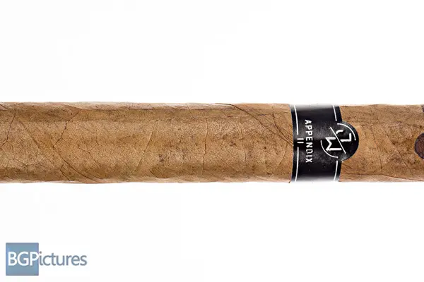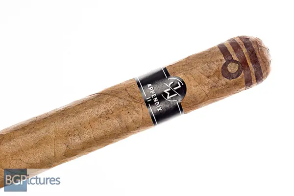 Jake Wyatt Cigar Co. Appendix II Toro Cigar Review – This 6×54 stick features a dark tan firmly packed wrapper with decorative maduro stripes at each end, minimal veins, tight invisible seams and triple cap with a faint cedar aroma. First light reveals a good draw with mild-medium notes of a dark wood and smooth smoke with a faint sweetness on the end of the long finish. The first third needed a small touchup with the sweetness coming up just a tad and the finish going a bit shorter. The 1/2 way point hits at 30 minutes with flavors drastically changing to a medium body with notes of a thick sweet honey and caramel with a deep woody long finish. Ending just short of an hour at the hot nub, the last third shifted again to just a sweet nutty honey all the way through.