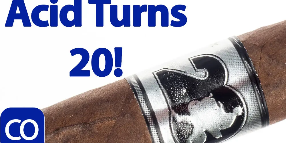 ACID 20 by Drew Estate Toro Cigar Review – This 6×50 flavored cigar features a dark chocolate, oily wrapper with small veins, tight invisible seams, triple cap and extremely pungent, sweet potpourri scent much like a blue label Acid.  First light reveals a sweetened tip with overwhelming sweet Christmas like flavors and a slightly snug draw.  The first third opens the draw nicely, with notes shifting away from pure sugar to a sweet slick spicy cocoa, very candy like. Burn is perfect with a bright white ash.  The 1/2 way point comes at 40 minutes with the sweetness dying down, a milk chocolate dominating the draw with the spice trailing away.  Ending at 1:10 the last third got hot and squishy going to a slight mint, light cocoa and hot retrohale.