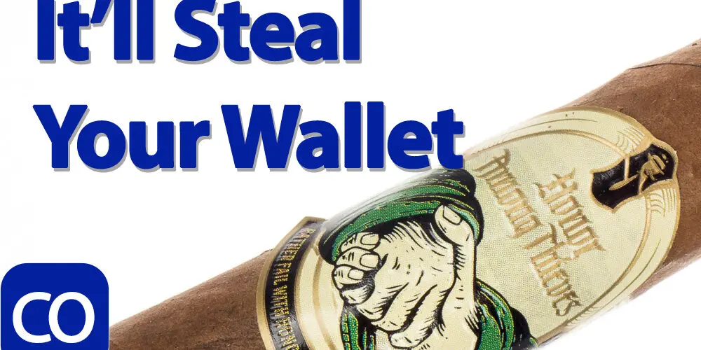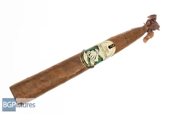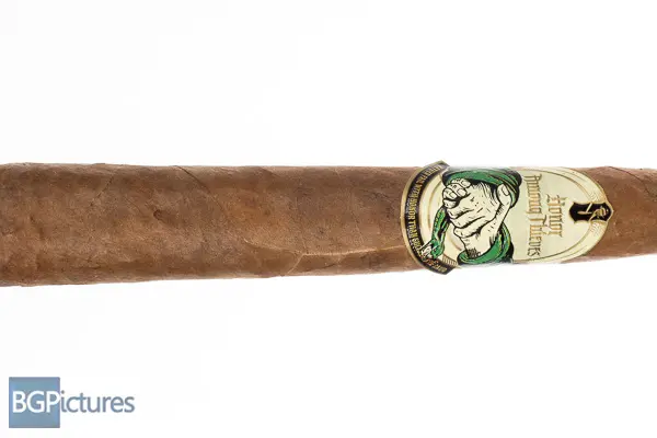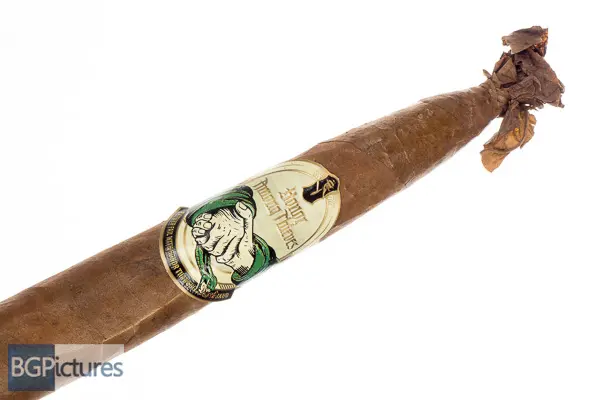 Sinistro Honor Among Thieves Trumpeta Cigar Review – This 6×58 long taper stick features a dense firm pack in a cone shaped wrapper with a dark chocolate, dusty oily wrapper with minimal veins, tight invisible seams, a flourished cap and faint sweet hay aroma. First light reveals a smack in the face full bodied, thick, chew smoke with a slightly sweet, deep earth and nut combo through a long finish of the same. The first third brings a building oily spice that sticks to the lips with notes largely the same just the generic sweetness going towards caramel. The 1/2 way point comes at 30 minutes with body back near full and flavors transitioned to a sweet, thick creamy caramel and coffee lasting through the long finish to the next draw. Construction is flawless holding a solid ash. Ending at 45 minutes the last third showed no changes.