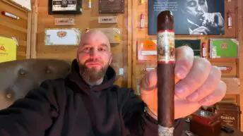 CAO Arcana Mortal Coil Toro Cigar Review – This 6.1×50 stick features a rich dark cocoa firmly packed oily wrapper with minimal veins, tight invisible seams, double cap and pungent raisin and chocolate aroma. First light reveals a perfect draw with plentiful full bodied smoke of a slight chocolate and big deep earth quickly followed by a touch of pepper and big building cayenne heat and oil over the lips and tongue. The first third comes down a tick to medium-full adding complexity with a sweet cocoa, deep earth and apricot on the draw while the finish brings the pepper up slightly and spice down. The 1/2 way point comes at a slow 40 minutes with notes dropping the apricot replacing it with a dark roast coffee that stick around on the finish. Body is down to medium and construction is flawless with a solid ash. Ending at 1:30 the last third remains medium bodied dropping the sweetness and cocoa sticking with a dark coffee and earth through the finish. A good bit of strength joins in at the nub.