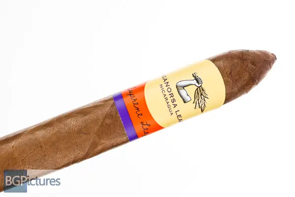 Aganorsa Leaf Supreme Leaf Torpedo Cigar Review – This 6×54 soft box pressed stick features a dark brown, oily slightly toothy firmly packed wrapper with a faint sweet tobacco aroma. First light reveals a perfect draw with a bold naturally sweet smooth tobacco joined by a zingy textures sweet pepper and cayenne that builds through the long finish. The first third comes up to a medium-full with a bit of the texture reaching the retro but still on the smooth side and the sweetness taking on a slight floral note. The 1/2 way point comes at 35 minutes with perfect construction dropping solid ash chunks. Notes are still very similar but a bit smoother still, with the finish getting shorter save for the pepper. Ending at 1:05 the last third remained the same with flawless performance to the cool nub.