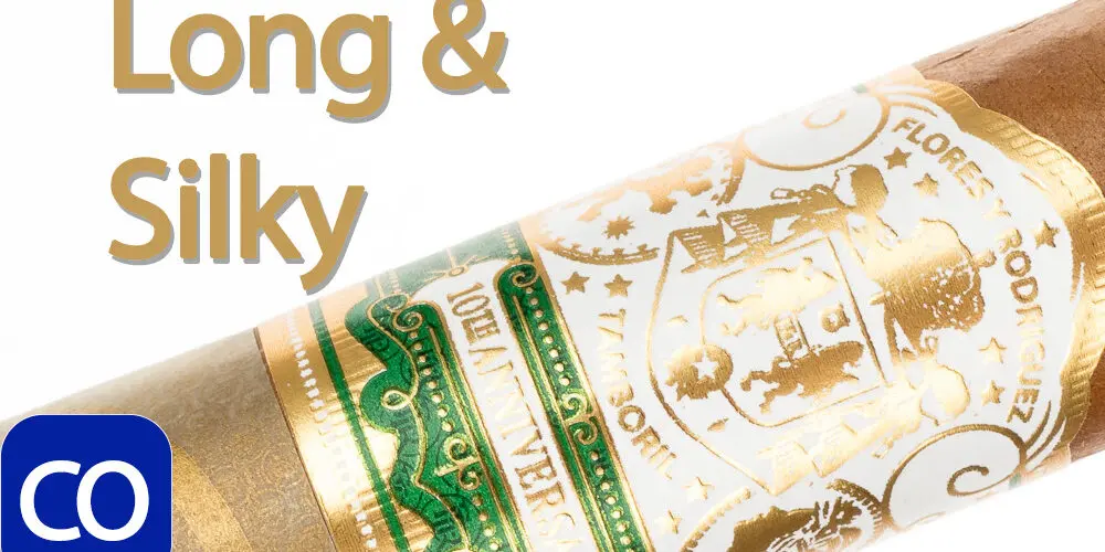 A. Flores Flores y Rodriguez 10th Anniversary Reserva Limitada Wide Churchill Cigar Review – This 5.75×58 stick features a buttery soft firmly packed dark brown wrapper with a large double cap and musty nutty aroma. First light reveals a perfect draw with a mild-medium body showing a silky soft nuttiness with a red wine like slight bite through the long finish. The first third burns perfectly and slowly keeping the same notes but up to a solid medium body, still with a long clean finish. The 1/2 way point comes at 40 minutes with the remainder ending at 1:20 adding a nice medium roast coffee to the mix, still on the smooth side with silky smoke. This video is sponsored by MontefortunaCigars.com