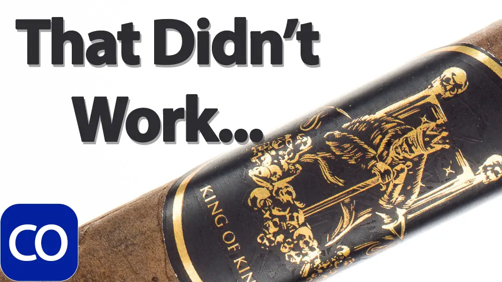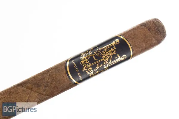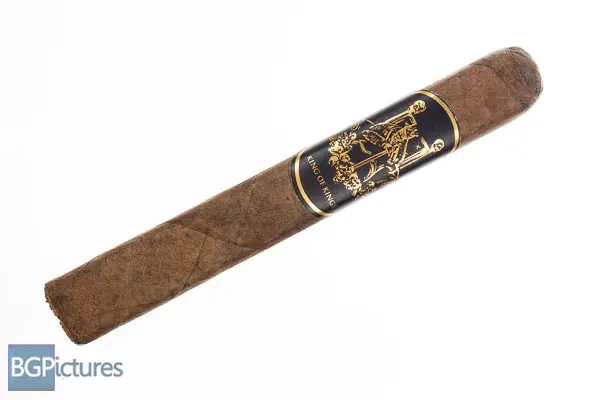 Sinistro King of Kings Cigar Review – This 6×50 box pressed dark chocolate stick features a firm sharp press, slightly oily toothy feel, triple cap and peppery, hay and cocoa aroma. First light reveals a perfect draw with thick creamy textured smoke showing a medium bodied raw earth with a slight dry cocoa and tingle building through the long finish. The first third needs a big touchup with the draw snugging up slightly and putting off a little less smoke needing double puffs. The 1/2 way point comes at 25 minutes with flavors the same and it needing a complete relight, it’s just not rolled very well. Ending at 40 minutes nothing else changed and it went out again.