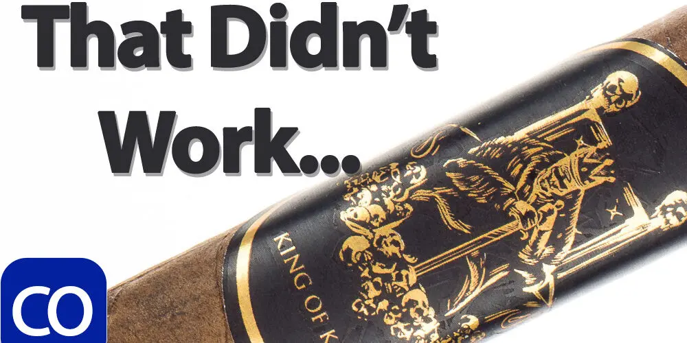 Sinistro King of Kings Cigar Review – This 6×50 box pressed dark chocolate stick features a firm sharp press, slightly oily toothy feel, triple cap and peppery, hay and cocoa aroma. First light reveals a perfect draw with thick creamy textured smoke showing a medium bodied raw earth with a slight dry cocoa and tingle building through the long finish. The first third needs a big touchup with the draw snugging up slightly and putting off a little less smoke needing double puffs. The 1/2 way point comes at 25 minutes with flavors the same and it needing a complete relight, it’s just not rolled very well. Ending at 40 minutes nothing else changed and it went out again.