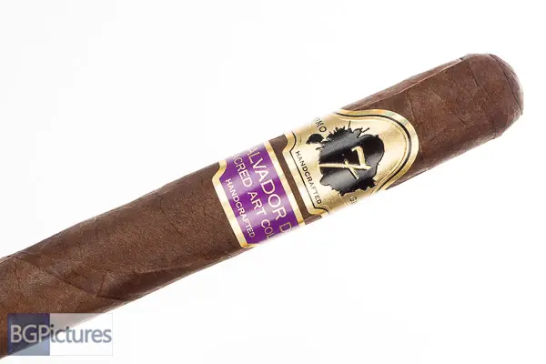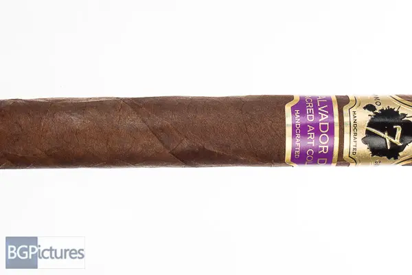 El Septimo The Sacred Collection Salvador Dali Cigar Review – This 6.5×54 stick features a dark chocolate, oily firmly packed wrapper with a fine tooth, large double cap and rich sweet musty cocoa aroma. First light reveals a perfect draw with lid-medium notes of a sweet coffee that goes to a cherry on the finish. The first third quickly goes to a medium body with the flavors of a coffee cake. Sweet, vanilla, mild coffee and bready, all on a long finish with a perfect burn. The 1/2 way point comes at a long 45 minutes dropping a solid ash with no flavor shifts. Ending at 1:25 the last third continued the perfect slow burn with the sweetness dying down, the coffee coming up and a nice leather joining in to the nub.