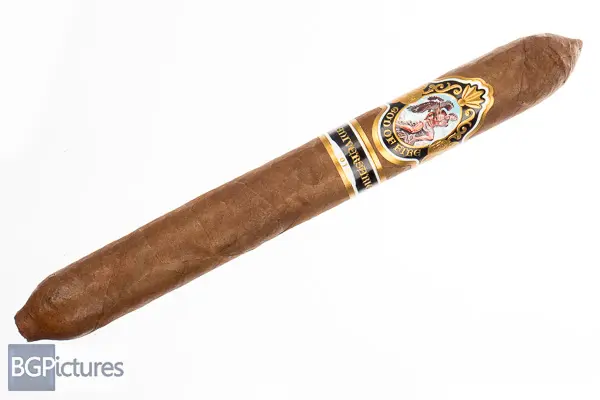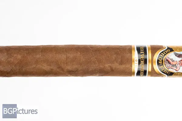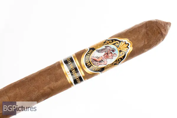 God Of Fire Serie Aniversario 54 Cigar Review – This 7.5×54 perfect stick features a dark tan wrapper with a firm, dry, light feel, tapered ends and rich sweet cedar aroma. First light reveals a perfect draw with dry, sweet grassy cocoa notes and a long smooth finish of the same. The first third quickly shifts to a medium body with silky smooth sweet vanilla, coca and spice notes with a long smooth finish to the next draw. The 1/2 way point comes at 50 minutes holding a solid ash with notes adding a slight oiliness and nuttiness especially on the draw, blending well with the cocoa and vanilla. Ending at 1:45 to the hot nub the last third remained consistent with perfect performance.