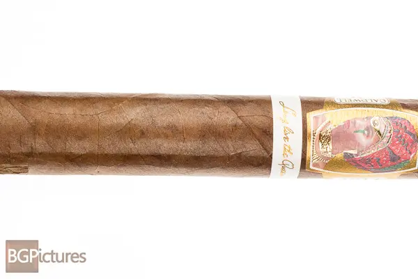 Caldwell Long Live The Queen Robusto Cigar Review – This 5×52 stick features a dark brown firmly packed silky smooth wrapper with triple cap and sweet tobacco and hay aroma. First light reveals a fairly snug draw with just ok smoke output and mild-medium bodied notes of a light earth and wood with a touch of pepper on the finish. The first third does loosen on it’s own after a time, with notes of bakers spices – nutmeg, cinnamon, allspice, vanilla and the slight pepper and earth all fading on the short finish. The 1/2 way point comes at 35 minutes with notes largely the same adding a caramel and thickness to the smoke, with perfect burn. Ending at 1:10 the last third remained the same to the nub.