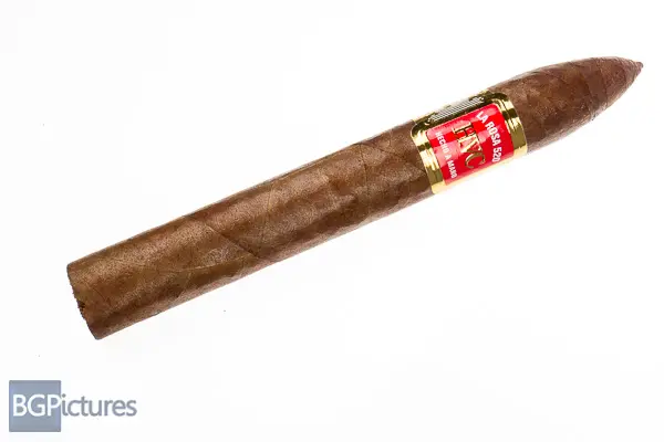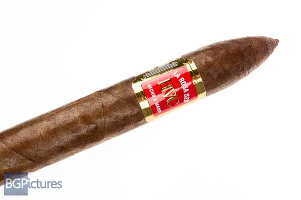 HVC La Rosa 520 Rare of Rare Cigar Review – This 6×52 torpedo stick features a dark cocoa mottled wrapper with a dense pack, firm pack, very oily fine tooth feel and a cocoa and hay aroma. First light reveals a full bodied very deep pepper and wood combo with the pepper hanging through the long warm finish, but with no texture or spice. Draw is perfect and smoke production thick and rich. The first third burns a little wonky, with body down to a medium, the pepper especially mellowing and the addition of a dark slightly sweet caramel joining in. The 1/2 way point comes at 35 minutes with the pepper down even more, the addition of a leather note and the body up a tick again to medium-full. Ending at 1:15 the last third burned slower, holding all the same notes to the nub.