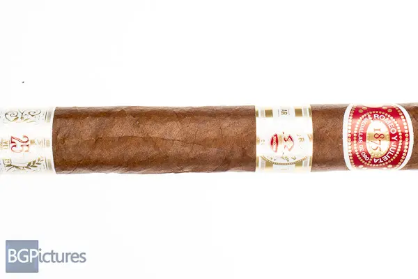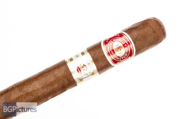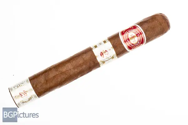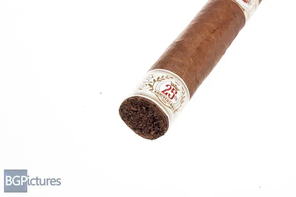 Romeo y Julieta Corona Cigar 25th Anniversary Toro Cigar Review – This 6×52 stick features a dark chocolate firmly packed slightly tooth oily wrapper with a large double cap and rich, pungent earthy cocoa aroma. First light reveals a flawless draw with thick full bodied smoke showing smooth creamy notes of a deep earth, dark cocoa and wood, with just a touch of heat through the retro and finish. The first third comes down a tick to medium-full, tempering the slight heat at the end and adding a bakers spice to the mix. The 1/2 way point comes at 35 minutes with notes going to a syrupy sweet cocoa and earth with a definite nutmeg joining in, all of which stick through the long full finish with perfect construction. Ending at 1:15 the last third gets hot at the nub keeping all the same flavors with a pronounced zinginess joining in through the finish.