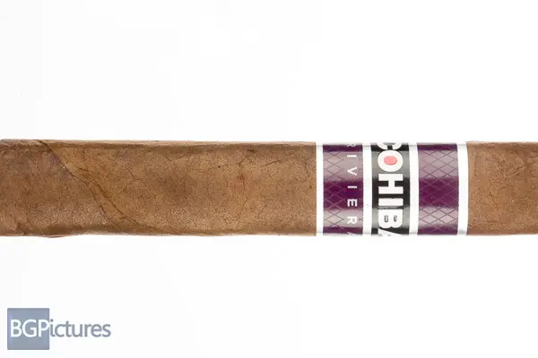 Cohiba Riviera Box Pressed Robusto Cigar Review – This 5×52 stick features a dark cocoa wrapper with an oily, slightly soft but evenly packed sharply pressed wrapper, slight tooth, large double cap and sweet, nutty leather aroma. First light reveals a flawless draw with plentiful medium-full rich smooth smoke showing a slightly sweet fruity cashew, creamy leather and slight pepper with a good bit of tingle through the long finish. The first half burns with perfect construction, pouring off thick rich smoke holding the same complex blend, adding a creamy note to the mix, all with a long smooth finish. The final third wraps up at 1:10 with notes staying near full bodied showing a sweet creamy smooth leather with a zingy pepper note added on the long finish.