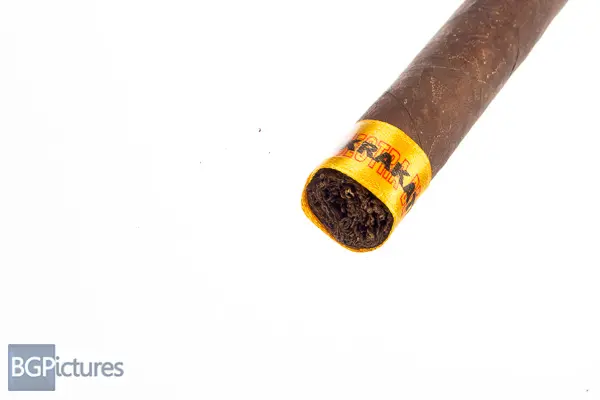 DT&T Muestra De Saka Krakatoa Cigar Review – This 6×48 stick features an extremely oily, fine toothed satin dark chocolate wrapper with a firm even pack, double pigtailed cap and rich musty sweet cocoa aroma. First light reveals a flawless draw putting out large volumes of smooth medium bodied smoke showing notes of a deep earth, peppercorn and zing on the long finish of the same. The first third drops a 1″ ash, burn is slightly fast with perfect draw and smoke output. Notes are largely unchanged with just the addition of a umami to the mix. The 1/2 way point comes at 30 minutes with a slightly slower burn, dropping the meatiness and replacing it with a dry cocoa, mixing with all the other notes still with a long full finish. Ending at 1:05 the last third burned even slower, with a strength slowly creeping in about even with body, both medium at this point, with flavors unchanged to the nub.