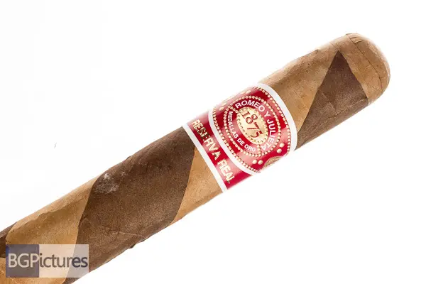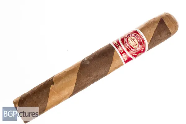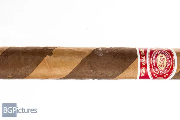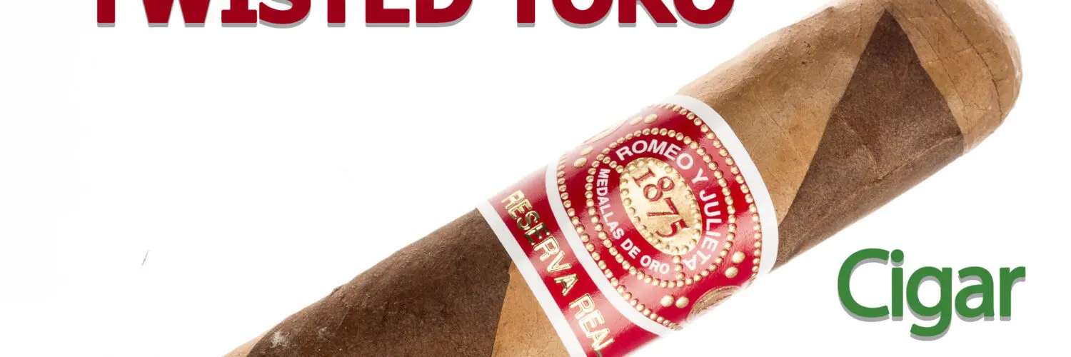 Romeo y Julieta Reserva Real Twisted Toro Cigar Review – This 6×54 barber pole stick features a firm even pack, dense feel, large double cap and sweet peppery hay aroma. First light reveals a very loose open draw with mild notes of a sweet cashew with plentiful but light smoke. The first third burns slow and steady keeping the same notes but needing a double puff to produce anything. Body is up to medium with a nice long finish. The 1/2 way point comes at 35 minutes with notes just adding a touch of cocoa to the mix, everything else the same. The ash holds for a solid chunk and performance is still great. Ending at 1:25 the last third burns completely differently, not needing a double puff, producing thicker richer smoke, the cocoa is more prominent and the burn super slow to the nub.