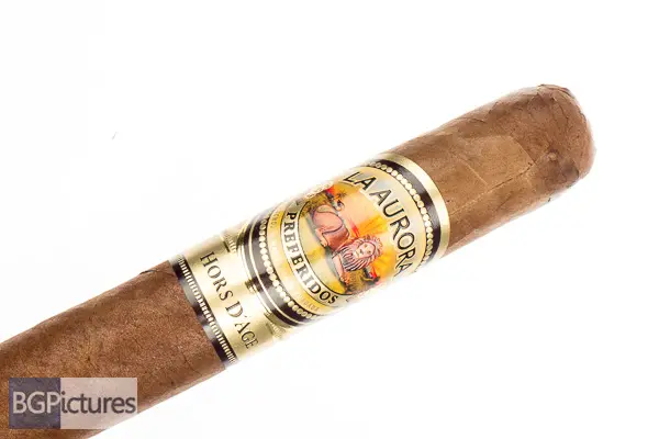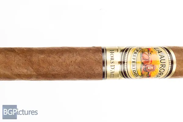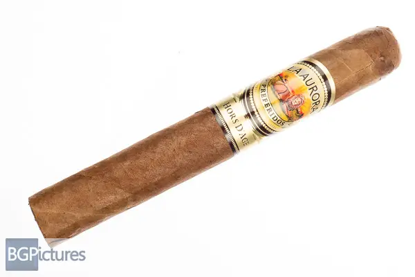 La Aurora Hors d’Age 2021 Cigar Review – This 6×54 limited release stick features a dense, dark brown satin wrapper with a firm even pack, large triple cap and rich, sweet must cocoa aroma. First light reveals a flawless draw with thick rich almost chewy smoke showing medium-full notes of a sweet umami, earth and pepper tingle through the finish which adds a bit of growing spice, with a warm retro. The first third continues the perfect performance with just the sweetness morphing in to a distinct caramel, mixing very well with all the other notes. The 1/2 way point comes at 30 minutes still with perfect burn and draw, dropping a solid ash with the same complex flavors and plentiful smoke. Ending at 1:25 the last third shifted to a deeper caramel with a pronounced zinginess and twang but light enough not to have the ashtray taste many do. Overall a complex but not too transitional stick with perfect burn to the nub.
