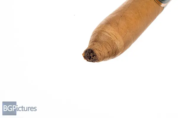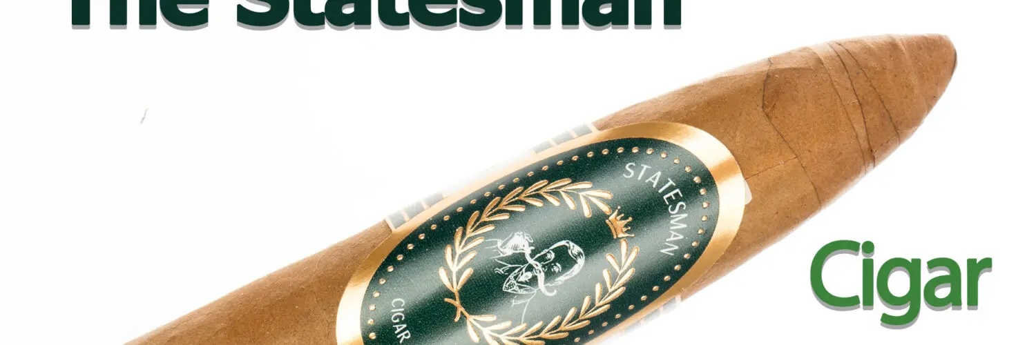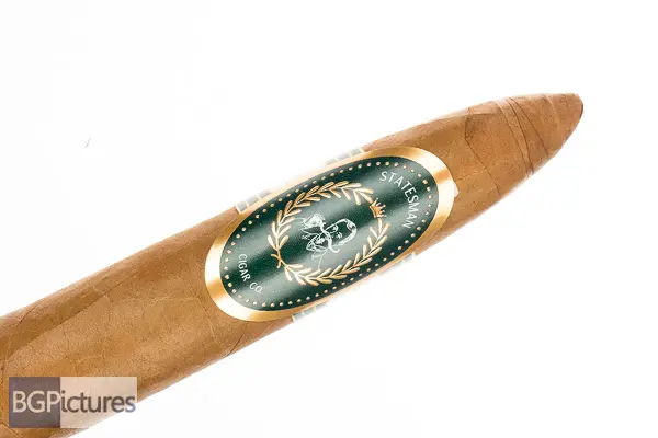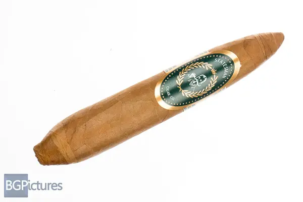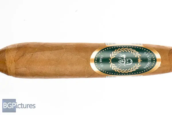 The Statesman Cigar Co The Statesman Cigar Review – This 5 3/8×52 figurado features a dark tan, buttery soft, light but firmly packed wrapper with a faint sweet nutty aroma. First light reveals a good draw with minimal mild-medium smoke as the cherry works through the shaped foot, with notes of a young tobacco, vegetal taste. The first 1/2 burns perfectly after getting to the full diameter area, with mild-medium sweet nuttiness and a fairly long smooth finish of the same. Ending at an impressively slow 55 minutes that 2nd half held the same notes and performance to the nub.