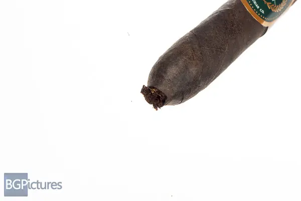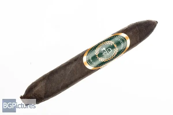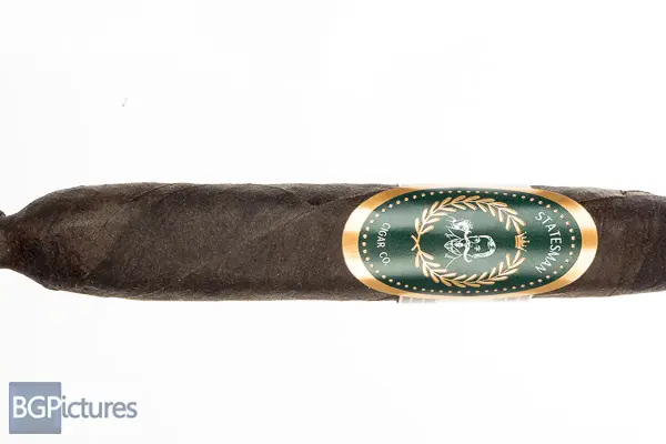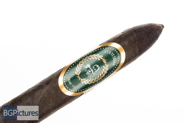 Statesman Cigar Co. The Nightcap Cigar Review – This 5 3/8×52 perfecto features an almost jet black thick oily wrapper with a firm pack, feather light feel, rough tooth and faint soapy aroma. First light reveals a flawless draw with plumes of mild-medium sweet jasmine smoke with a silky smooth retro and finish. The first third continues the perfect performance with no flavor changes. Ending at 45 minutes the remainder shifted slightly to a tingle of dry dusty cocoa, still with the floral base, plentiful smoke and super smooth presentation.