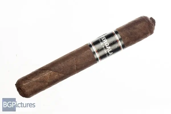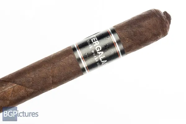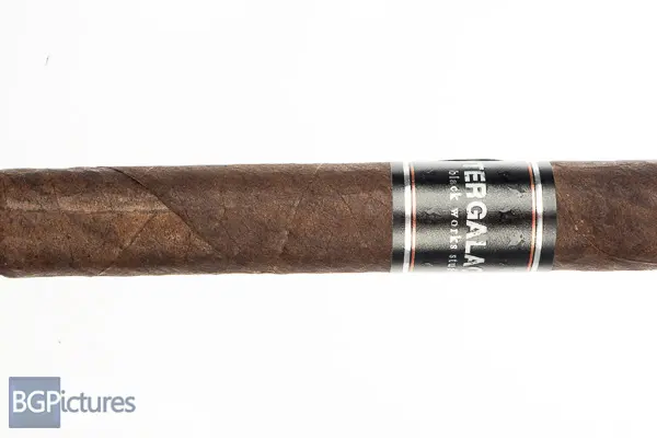 Intergalactic Event Horizon by Black Works Studio Petite Corona Cigar Review – This 4.75×46 stick features a very dense, oily, firmly packed almost jet black wrapper with a satin feel, small pigtail cap and semi-closed foot with a slightly damp cocoa aroma. First light reveals a flawless draw with plumes of thick rich medium=full bodied notes of a slightly sweet cocoa, nuttiness and white grape zing, all carrying through the long finish. The first third burns perfectly and slowly with a BIG flavor bomb of peat with a dry cocoa core, both sticking around to the next draw. 1/2 way through at 40 minutes there’s a big shift to still a near full body of a slightly sweet coca, deep coffee and thick leather. Ending at 1:05 the last bit remained consistent with flawless construction to the hot nub.