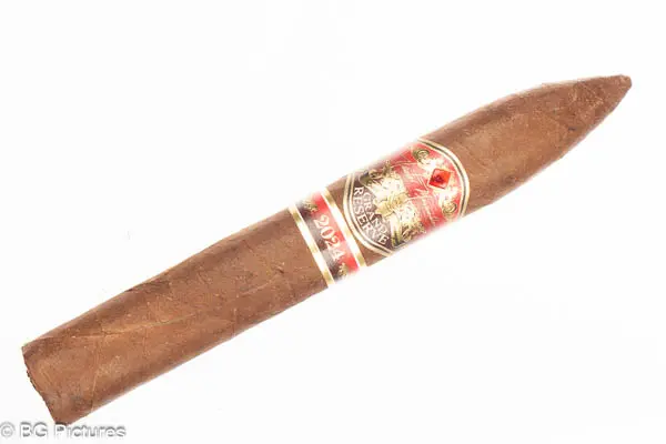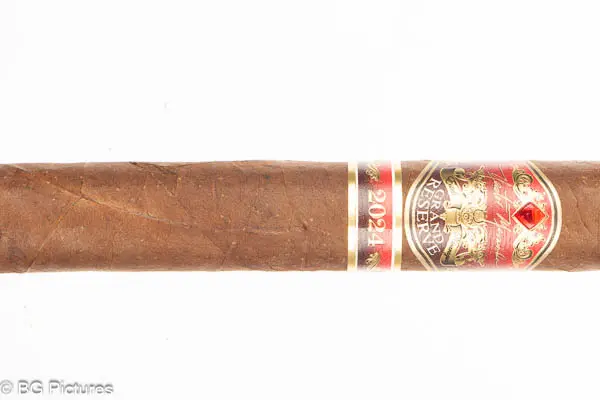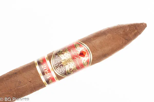 Nestor Miranda Grand Reserve 2024 Cigar Review – This limited edition 6 1/8×52 belicoso stick features a slick, oily buttery soft dark brown wrapper with a dense, firm pack with a rich, sweet cocoa aroma. First light reveals a good draw with plentiful medium-full bodied smoke showing heavy thick notes of a dark hay, heavy earth and building zesty pepper through the long finish. The first third opens up and burns very slowly, with a dark roast coffee joining the mix while the pepper just hits on the tail of the finish. The 1/2 way point comes at a slow 45 minutes with flavors unchanged, the ash dropping in a solid chunk and flawless construction. Ending at 1:25 to the hot nub, flavors shifted to a dark coffee and deep leather, dropping the earth and pepper.
