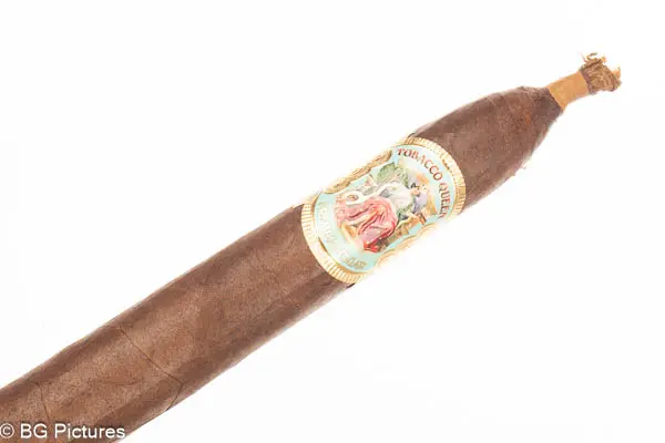 Tobacco Queen Solomon Cigar Review – This 7.25×57 perfecto stick features a dark cocoa buttery soft, oily wrapper with a firm even pack, striped tapered foot and head topped by a feathered flute. First light reveals a perfect draw with plentiful rich medium bodied smoke showing a slightly sweet pepper and yeasty bread note with a straight tobacco joining through the long smooth finish. The first third split down 1/2 the cigar just sitting in the ashtray, exploding the binder and wrapper. Cutting it down below the crack, the rest also cracked open, with hardly any flavors to be had. Tarballs quickly showing at the head ended the review very early.